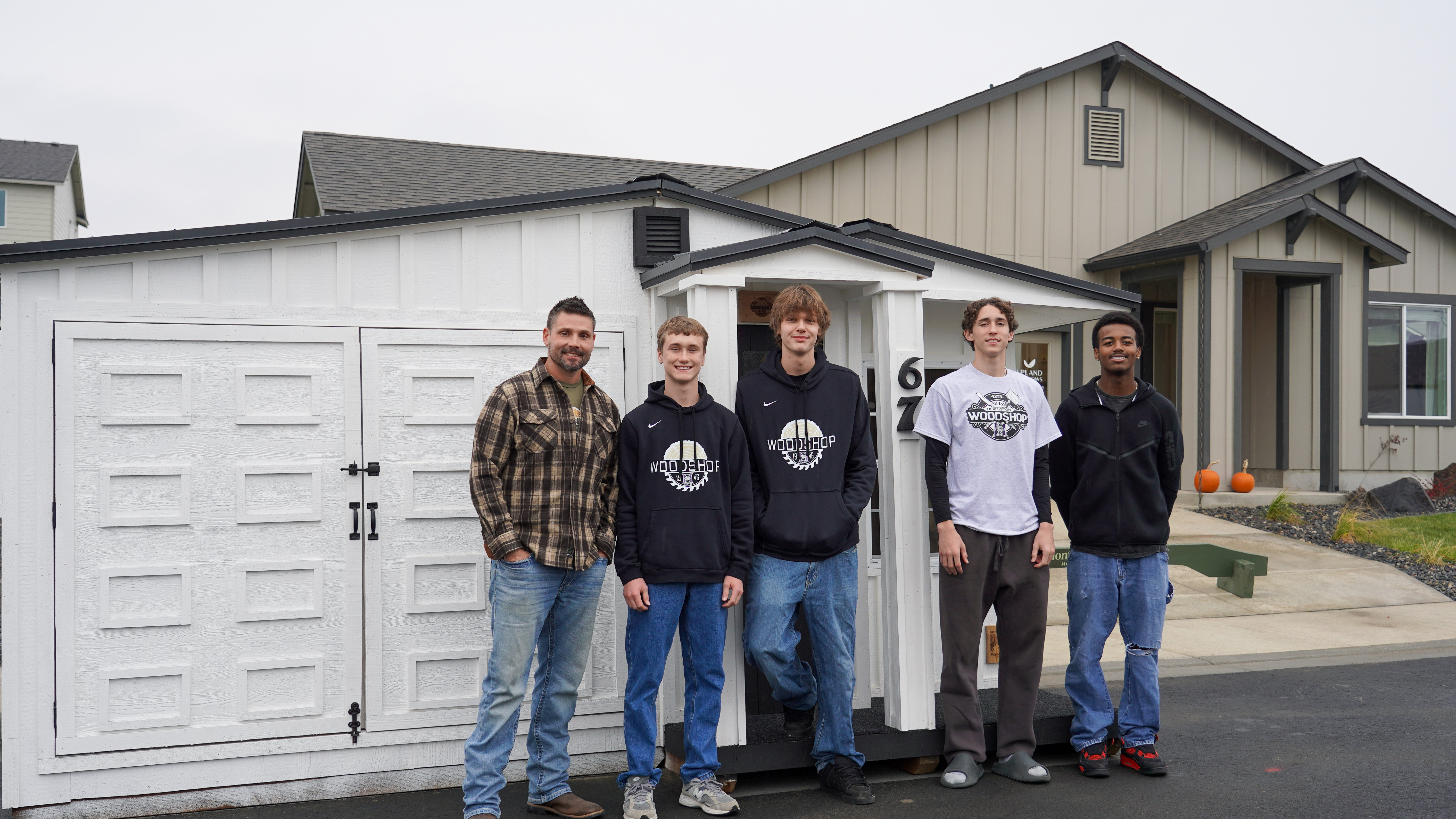 Students in Hermiston High School’s Construction Tech 2 class recently completed a custom-built playhouse, modeled after a Montevista Homes design. The project was part of a real-world learning partnership that connected education, industry, and community. Commissioned to help promote Montevista’s new Upland Meadows development, the playhouse showcases the craftsmanship and teamwork students are developing through hands-on instruction. Click here to read the full press release. ![]() Left to Right: Micha Mercer, Adam Thomas, Logan Vertrees, Lane Simmons and Nathaniel Henderson. |